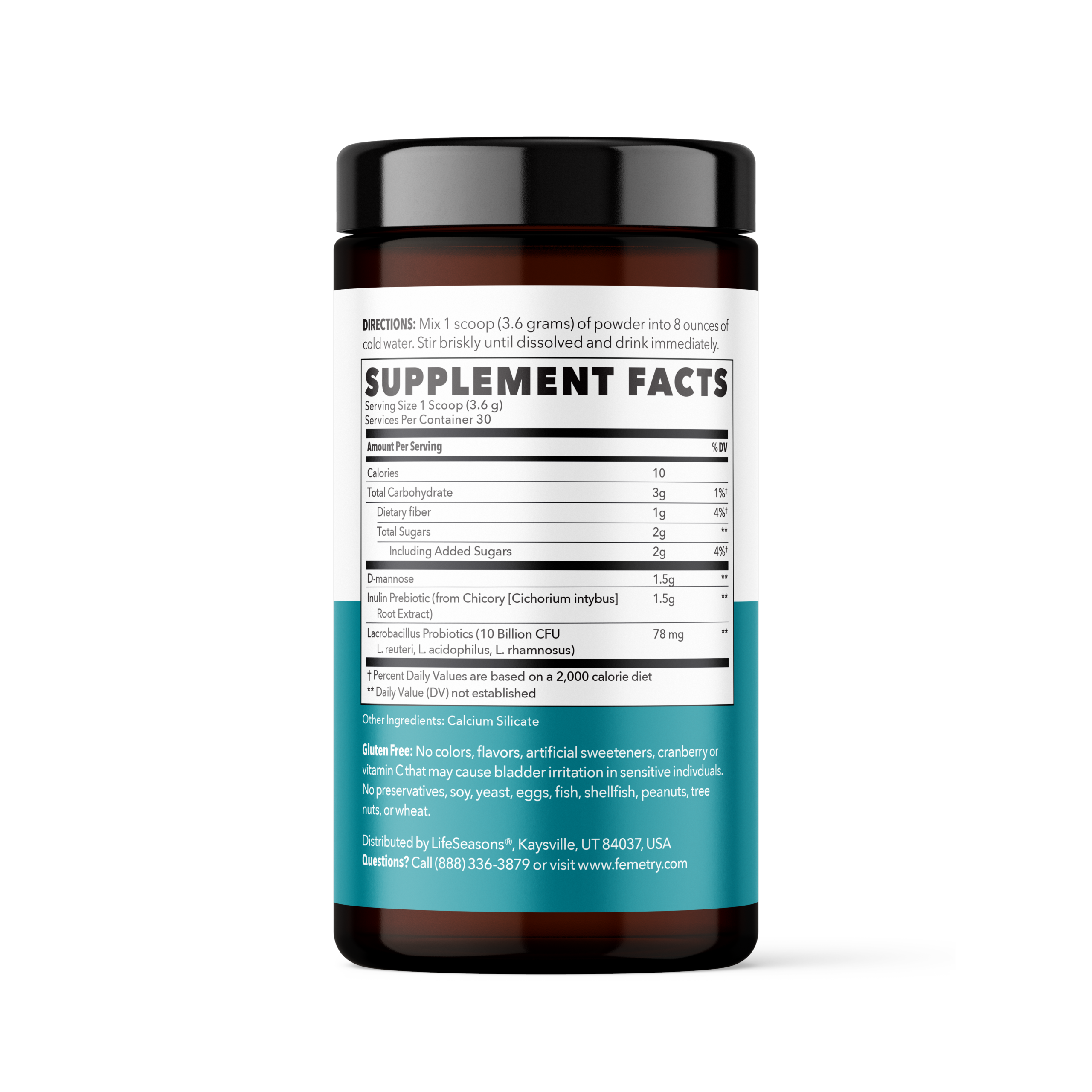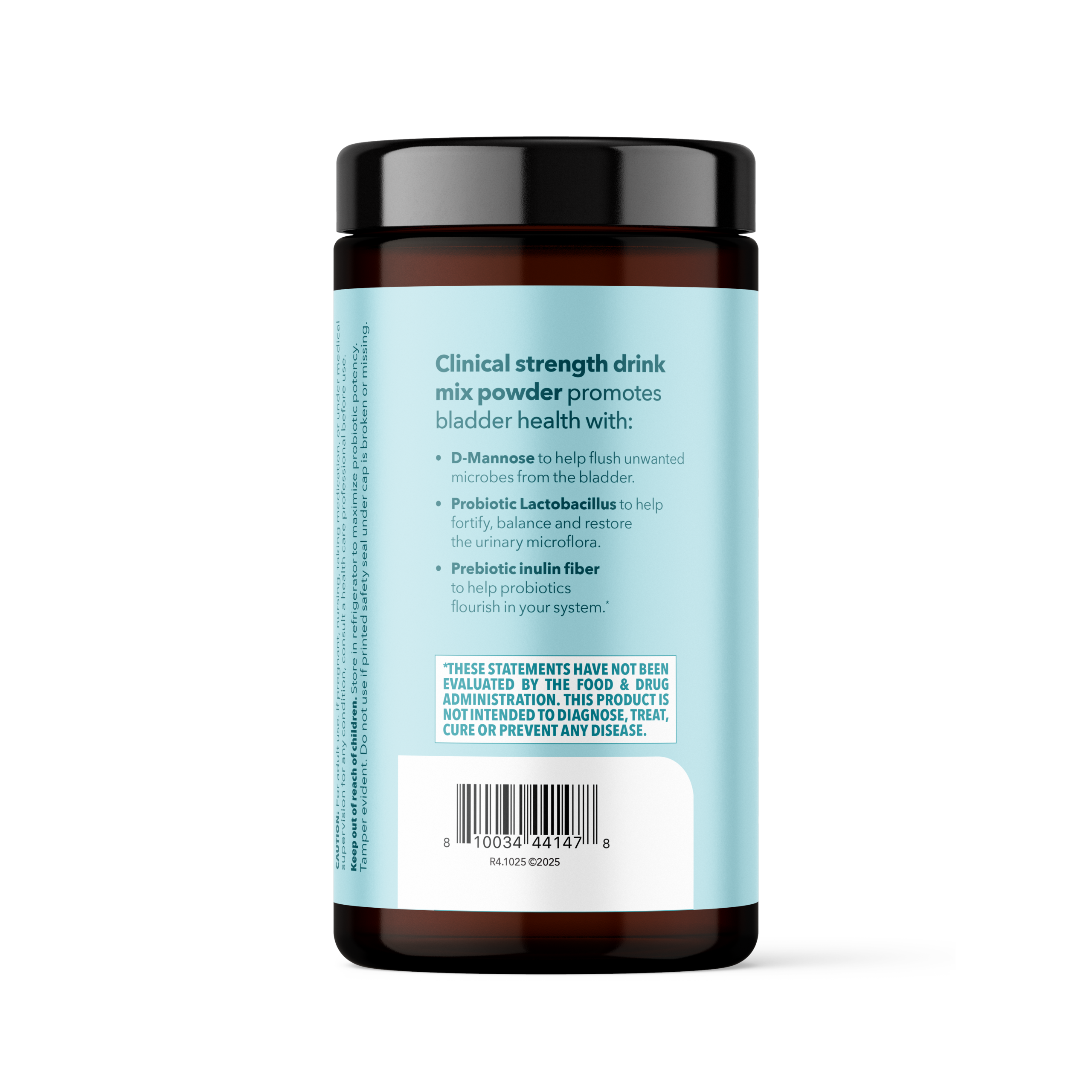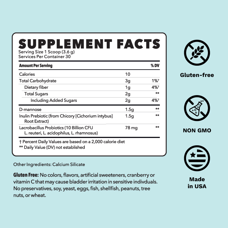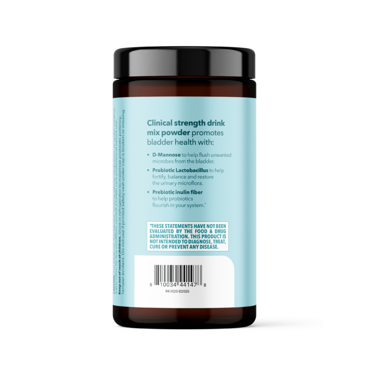The effective clinical dose of D-mannose and prebiotic fiber is too large to be conveniently taken in pills. But they dissolve easily into a glass of water. The result is a colorless, practically tasteless drink without any added colors, flavors, or sweeteners that could cause your bladder to flare.
